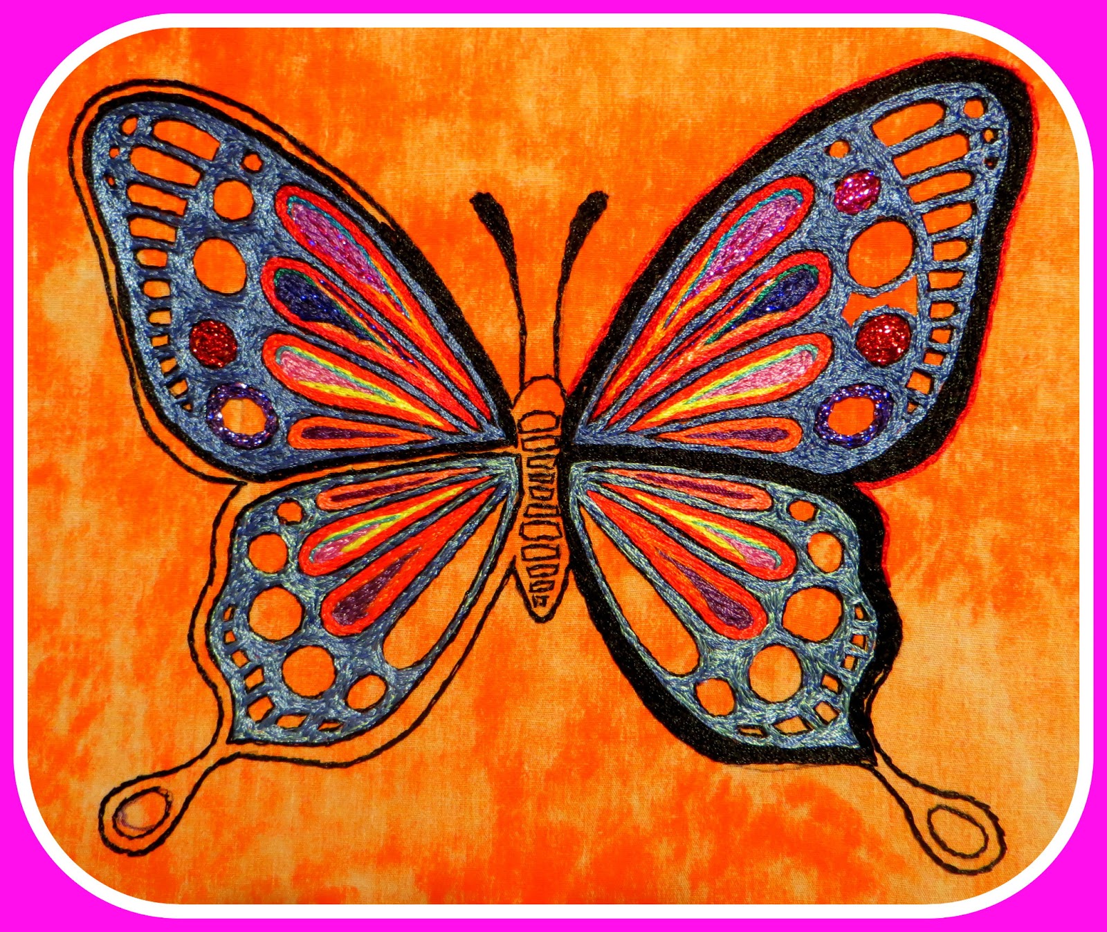 I painted the very edges of the wings with black acrylic. I then mounted the embroidery onto a slice of leather . Then I carefully cut the wings out . I then added my jewel , which is a clear , flatish , glass blob.with angelina film underneath . I made a double thick leather circle , and attached the wings . I also sprinkled some jet black glitter around the jewel . I find that diamond glaze works for me when it comes to glueing it all in place .It is around 13 inches in length .